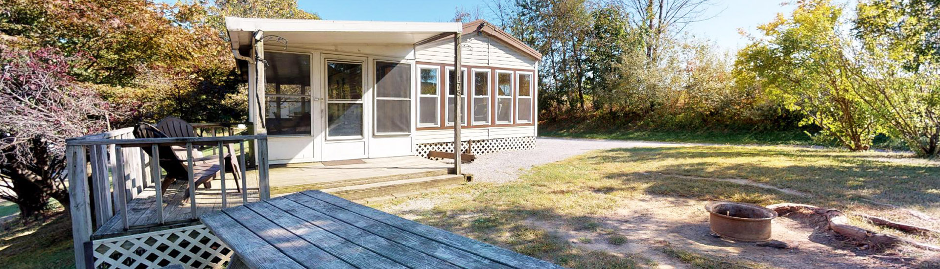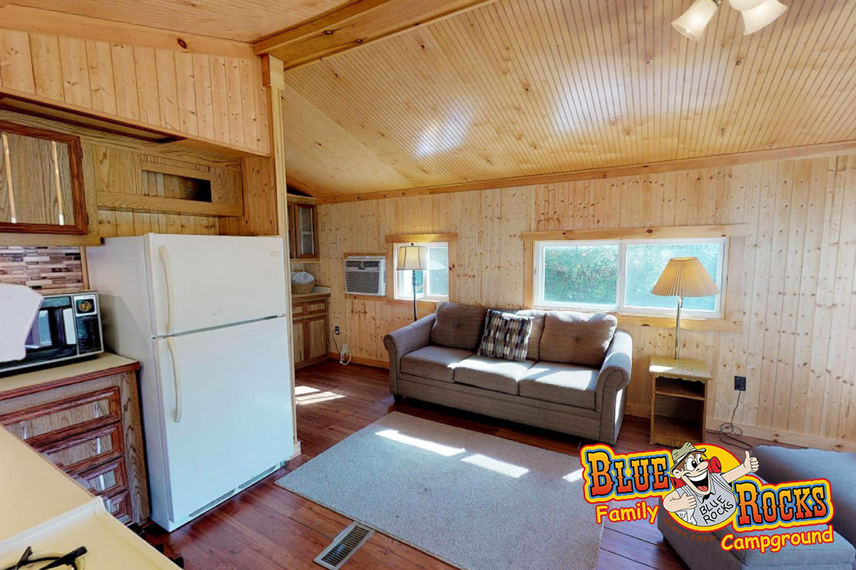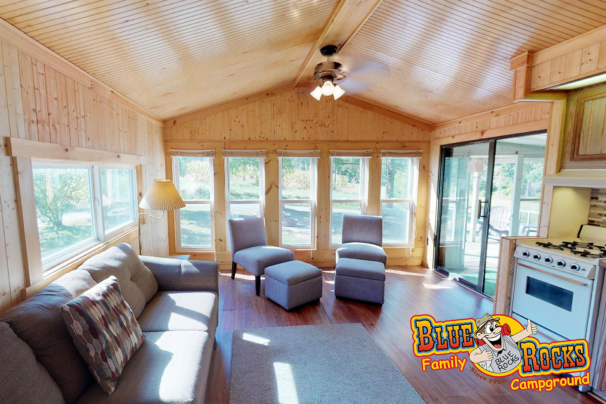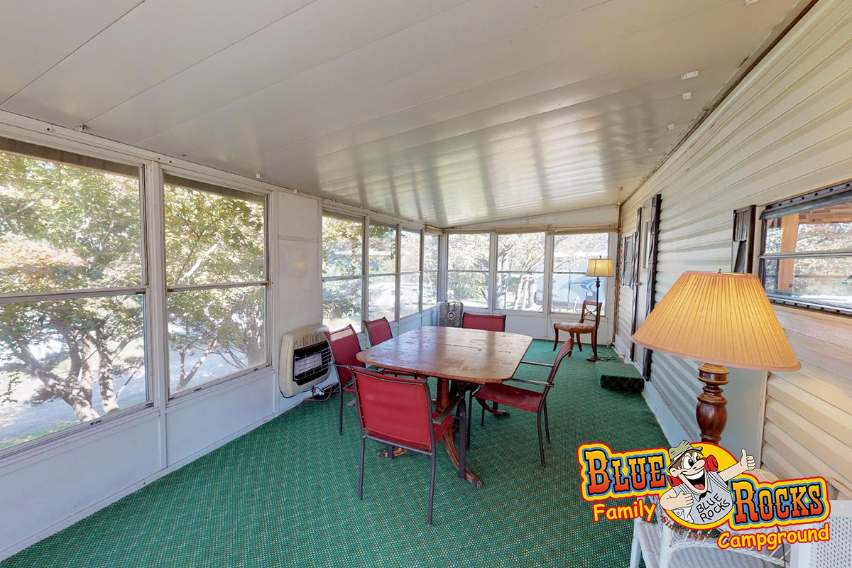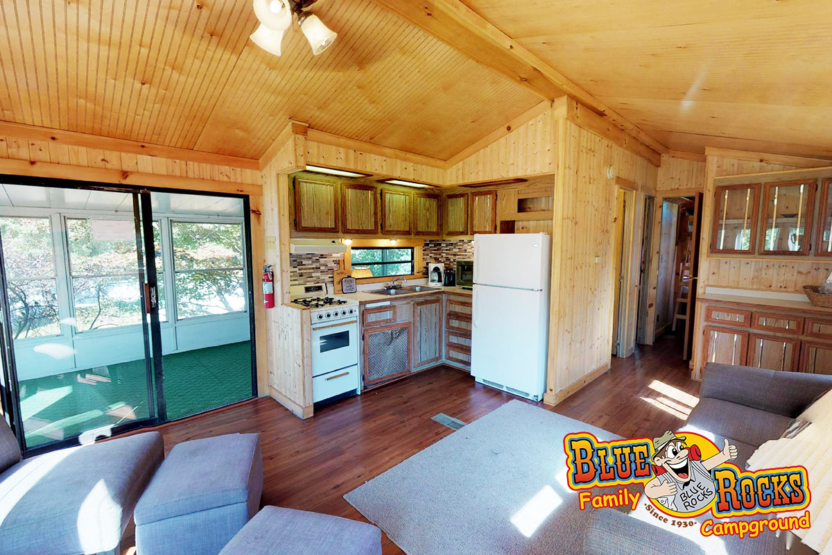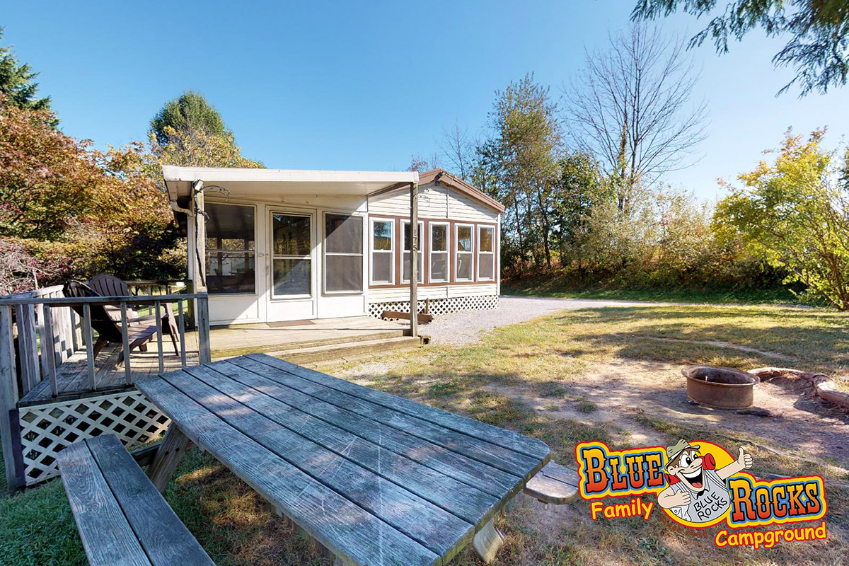 Perched on a hill with a beautiful porch view, Cottage #175 provides all the comforts of home coupled with the ultimate in family camping. Features a full kitchen, bathroom with shower, screened-in porch, fire ring, picnic table, heat and air conditioning, and 2 bedrooms (1 full bed, 2 bunk beds). Tents can be added outside for an additional cost.