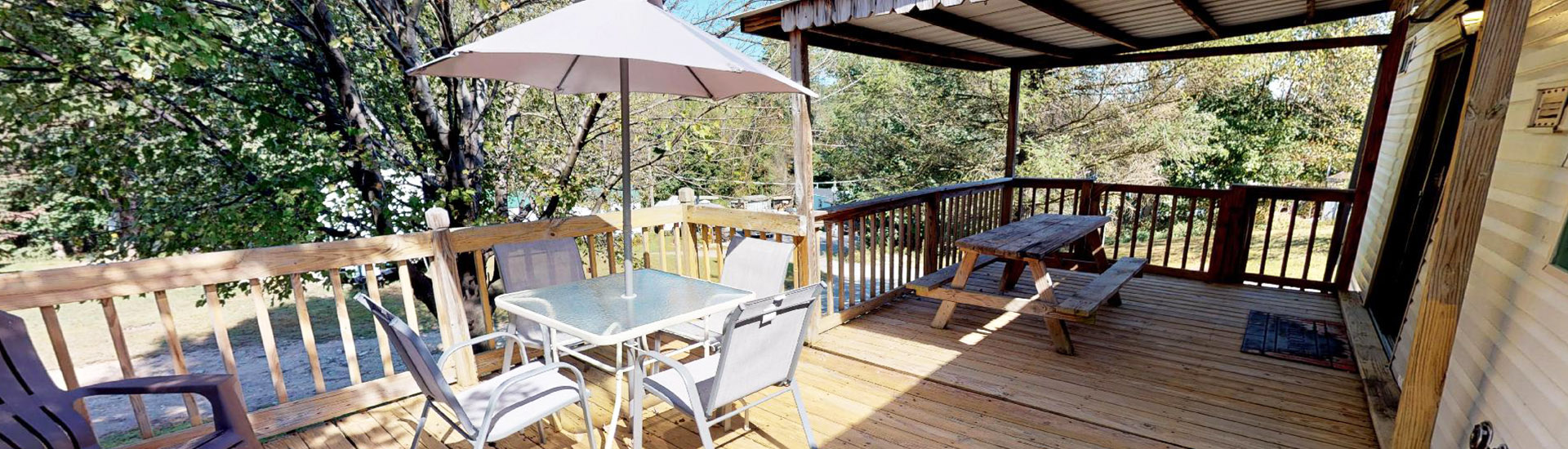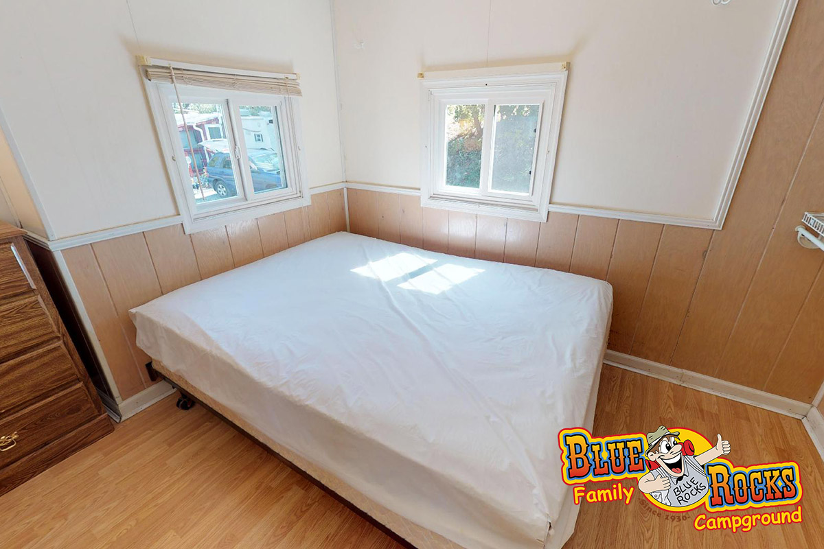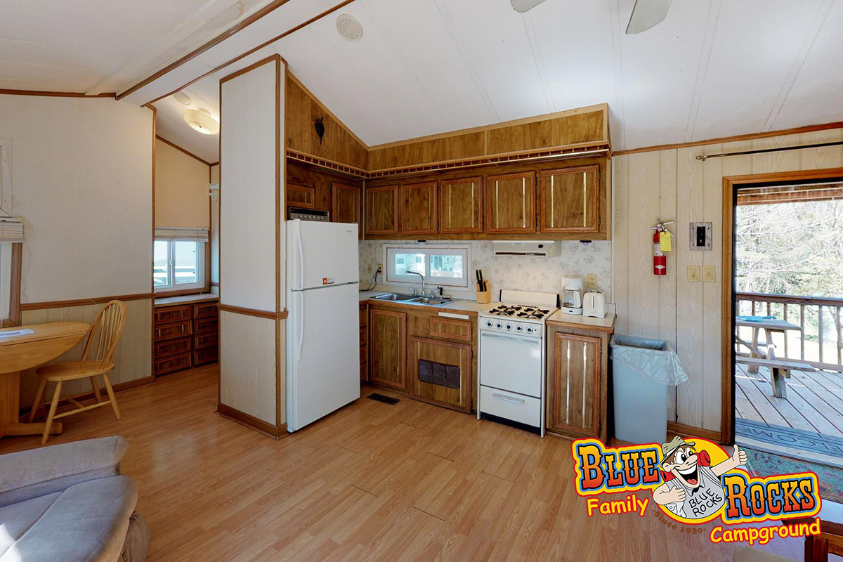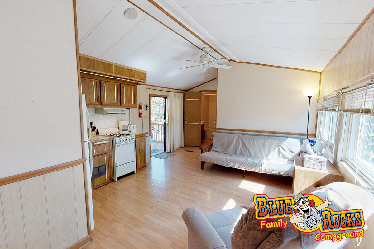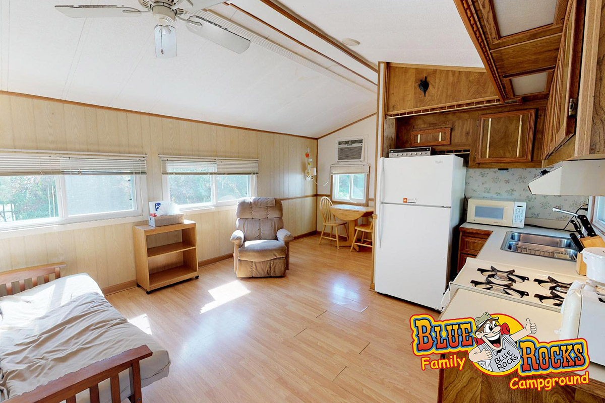 Cottage #180 offers privacy and all the comforts of home for those wanting a relaxed, comfortable camping experience. Features a full kitchen, bathroom with shower, covered porch, fire ring, picnic table, heat and air conditioning, 1 full bed, and 1 futon.